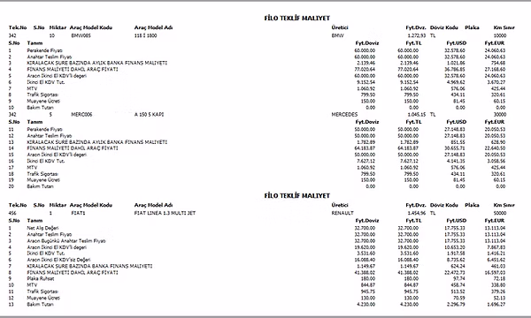 Kiralama sistemine ait özel Raporlar sistemde mevcut olup, Kiralama ve Filo Yönetimi Araç, Servis, Yedek Parça, Finans ve Genel Muhasebe adımları ilee Full Entegre çalışmakta ve işletmelere hizmet vermektedir.