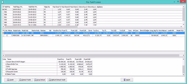 Araç Tedarik kanalları, Araç Alımda Finans ve Kredi Yönetimi, Araç maliyetlendirme, Kiralama Sürecine göre Araç Ön Maliyetlerin otomotik hesaplanması ve Kiralanacak AY sayısına göre Kiraya verilmesi gereken minimum Aylık Tutarın Hesaplanarak Teklif sunulması, sözleşme süreci, otomatik sözleşme metinleri basımı, Evrak ve Belge Akışı süreçleri ile Kiralama süreci boyunca yapılan Sigorta, Kasko, Servis Bakımları, Lastik, Akü, Finans Maliyetleri, Hasar Dosyaları, İkame Araç Değişimleri gibi bütün süreçlerin Şase/Plaka bazında hesaplanması yapılmaktadır. Bu hesaplamalara göre Her Ay BAŞA-BAŞ Maliyet-Karlılık Raporları ile Kiradaki bütün araçlar otomatik takip edilmektedir.
